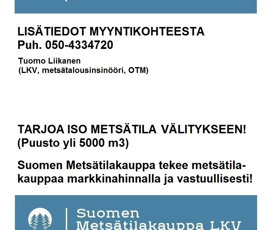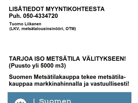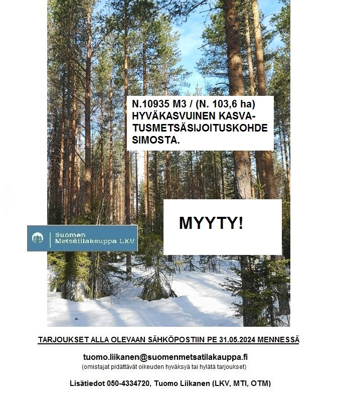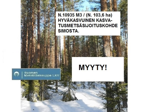 N. 10935 m3 / n. 103,6 ha hyväkasvuinen kasvatusmetsäsijoituskohde Simosta tien vierestä. MYYTY! Tarjoa sinäkin iso metsätila välitykseen! Lisätiedot 050-433720