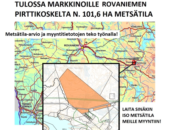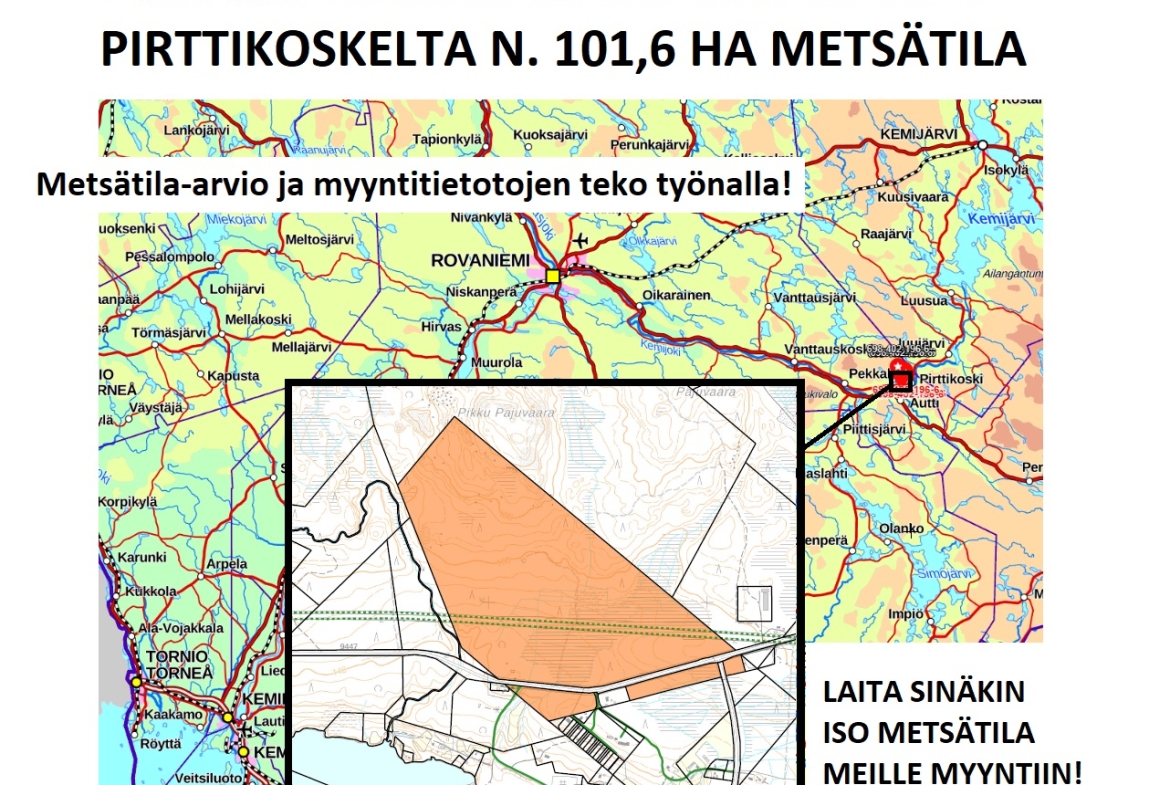 ROVANIEMEN PIRTTIKOSKELTA N. 101,6 HA METSÄTILA. Pikitien vierestä hieno kokonaisuus. Tulossa markkinoille lähiaikoina. Lisätiedot 050-4334720, Tuomo Liikanen.
